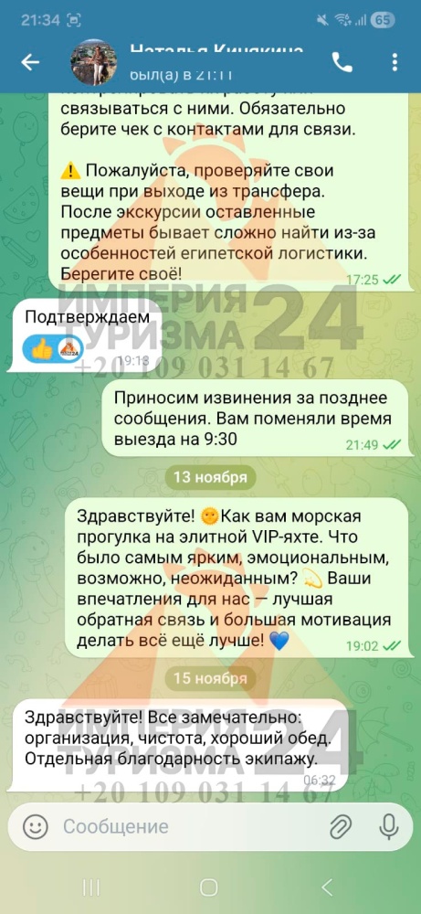 Просто напишите нам в WhatsApp или Telegram - и всё! Укажите название экскурсии, дату, отель, номер комнаты и свой контактный телефон. На сайте вы найдёте удобные иконки - кликаете, и уже на связи с нами.