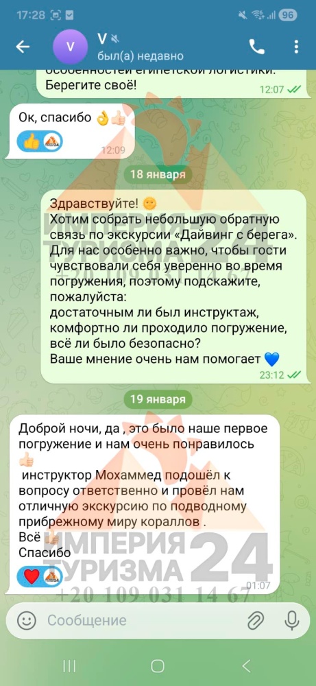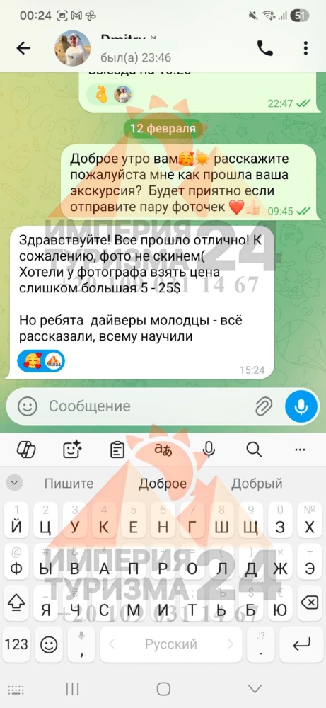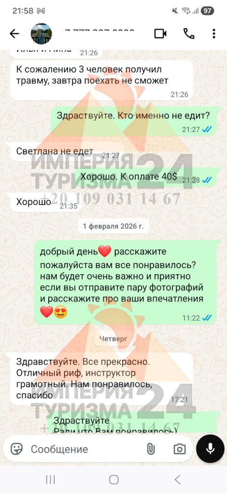 Просто напишите нам в WhatsApp или Telegram - и всё! Укажите название экскурсии, дату, отель, номер комнаты и свой контактный телефон. На сайте вы найдёте удобные иконки - кликаете, и уже на связи с нами.