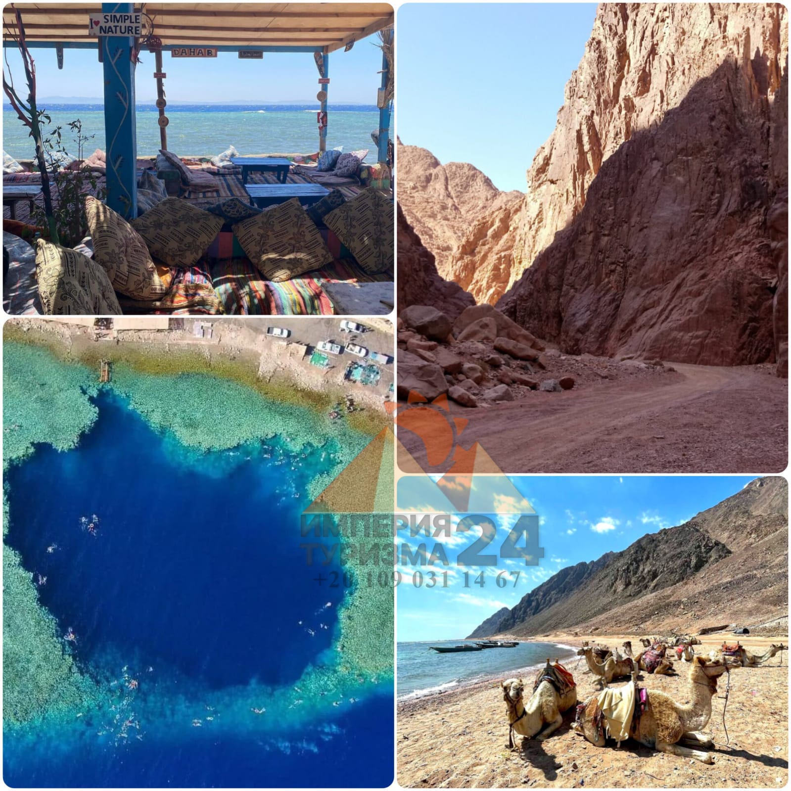 Дискавери 4 в 1 + Голубая дыра: Голубая дыра Абу-Галум + Каньон + Верблюд + ОбедДахаб — это гармония моря, пустыни и гор, место, где природа создаёт картины, не уступающие лучшим произведениям искусства. Путешествие начинается в заповеднике Абу Галум, который притаился на берегу Акабского залива. Здесь сохранились рифы в их первозданной красоте, а самой известной достопримечательностью является Голубая Дыра. Этот карстовый провал глубиной около 130 метров поражает своей загадочностью. С высоты он кажется тёмно-синим кругом в бирюзовых водах, а под водой открывается удивительный коралловый мир, который можно рассмотреть во время снорклинга. После морских впечатлений нас ждёт прогулка в каньон Эль-Туайлат. Узкие песчаные коридоры, высокие стены, игра света и тени создают сказочную атмосферу. Здесь вы почувствуете полное единение с природой и сможете сделать потрясающие фотографии. Особое удовольствие подарит короткая поездка на верблюдах вдоль морского побережья. Шаг за шагом, в ритме пустыни, вы сможете насладиться видами и атмосферой восточного колорита. Завершим день в самом сердце Дахаба — на восточном базаре с ароматными специями и яркими сувенирами — маленькие детали, которые сохранят память об этом дне.