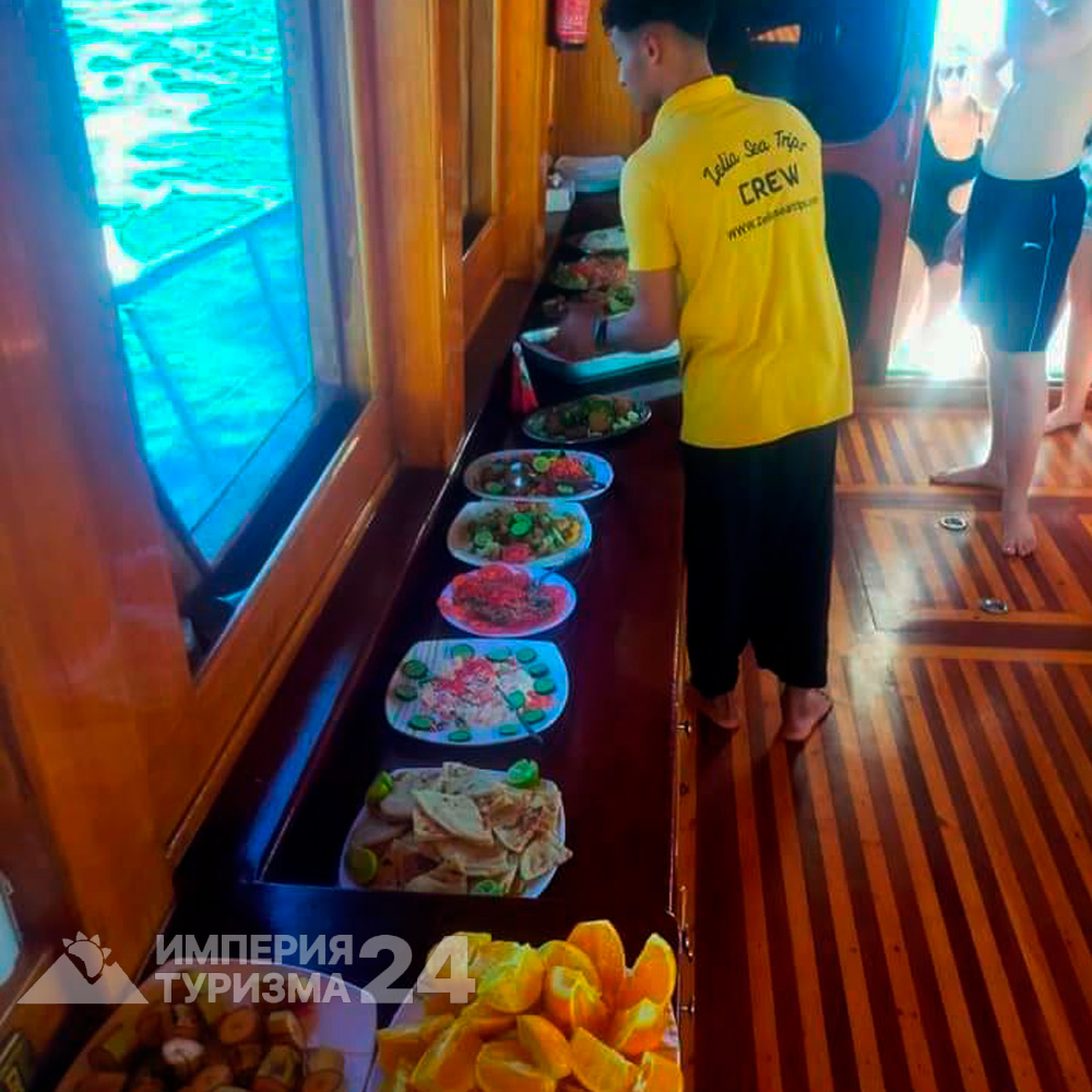 Обед и безалкогольные напитки на яхте (разные салаты, рис, макароны, картофель, наггетсы, рыба/мясные колбаски; кола, пепси, вода, чай, кофе);