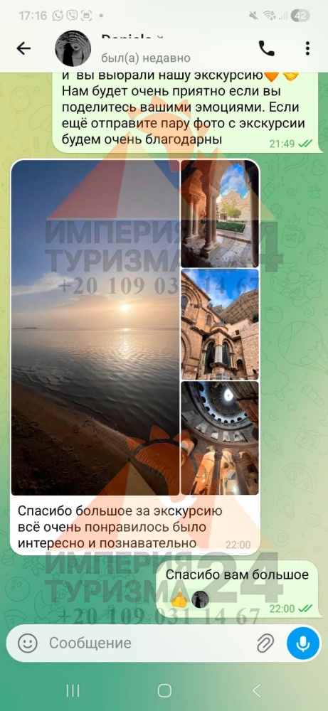 Просто напишите нам в WhatsApp или Telegram - и всё! Укажите название экскурсии, дату, отель, номер комнаты и свой контактный телефон. На сайте вы найдёте удобные иконки - кликаете, и уже на связи с нами.