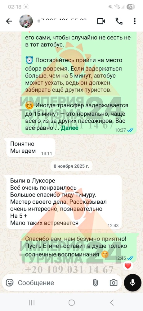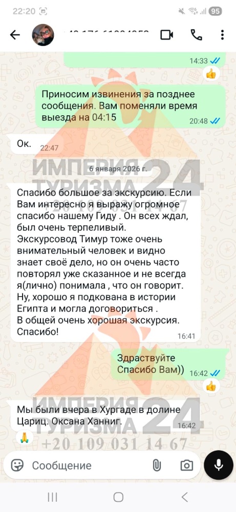 Спасибо, что выбрали нашу компанию и поделились своим мнением ? Рады, что в целом вы отметили хорошее соотношение цены и количества посещённых объектов. По поводу курения водителя — понимаем ваше замечание. К сожалению, в Египте действительно нет строгого закона, запрещающего курение в транспорте, и для местных жителей это часть привычной культуры. Мы стараемся контролировать такие моменты и обязательно дополнительно обратим на это внимание. Что касается формата экскурсии — иногда гид даёт основную информацию перед посещением объектов, а затем предоставляет свободное время для самостоятельной прогулки и фотографий. Для многих гостей это, наоборот, плюс, так как появляется возможность спокойно осмотреть локации в своём темпе. Благодарим за обратную связь — она помогает нам становиться лучше.