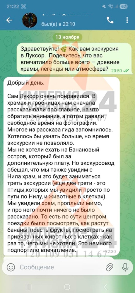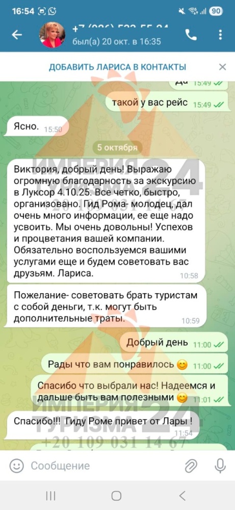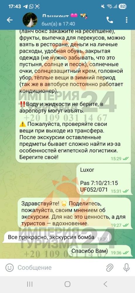 Билеты приобретаются на доступные чартерные рейсы, при этом иногда возможны задержки вылетов из Луксора в вечернее время. К сожалению, авиакомпании заранее об этом не предупреждают, и повлиять на их решение мы не можем. Поэтому возвращение в отель иногда бывает позже запланированного времени;