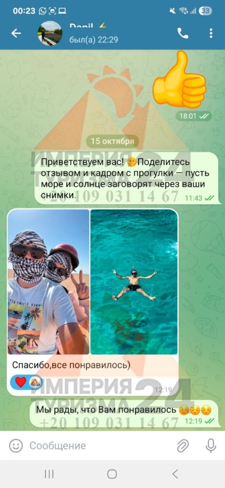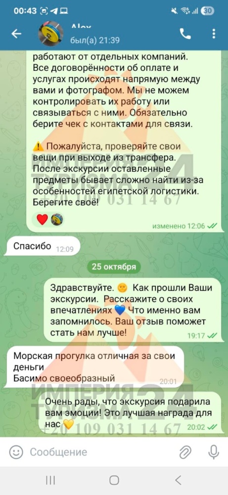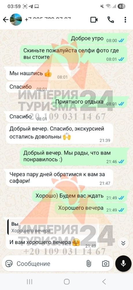 Просто напишите нам в WhatsApp или Telegram - и всё! Укажите название экскурсии, дату, отель, номер комнаты и свой контактный телефон. На сайте вы найдёте удобные иконки - кликаете, и уже на связи с нами.