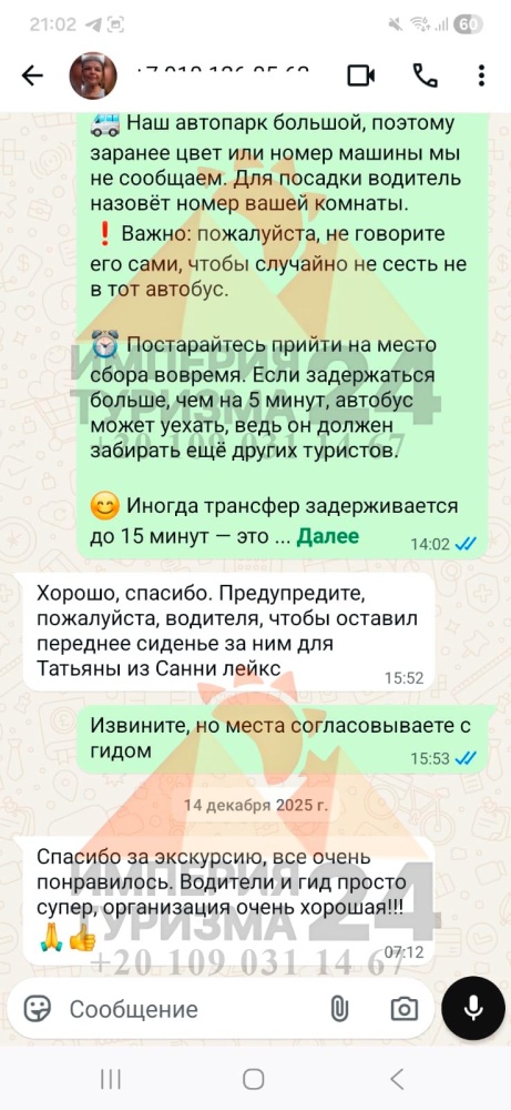 Время выезда и возвращения, указанное на сайте - ориентировочное. Не волнуйтесь! Накануне экскурсии мы отправим вам точное время сбора и что брать с собой в WhatsApp или Telegram. Так что просто оставайтесь на связи.