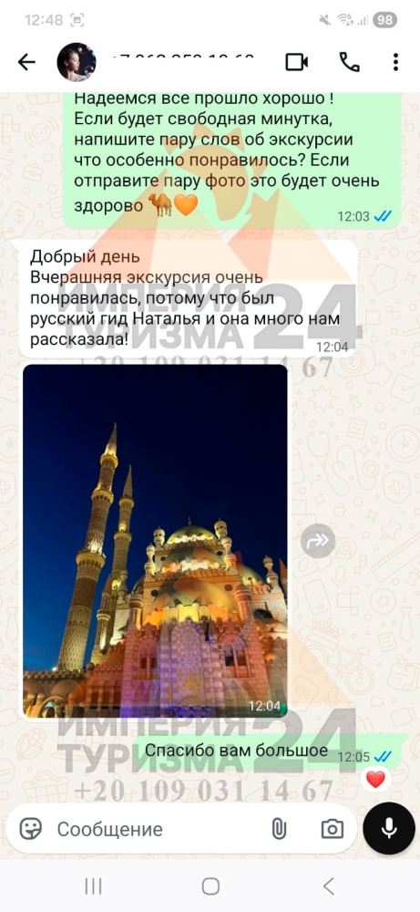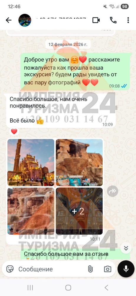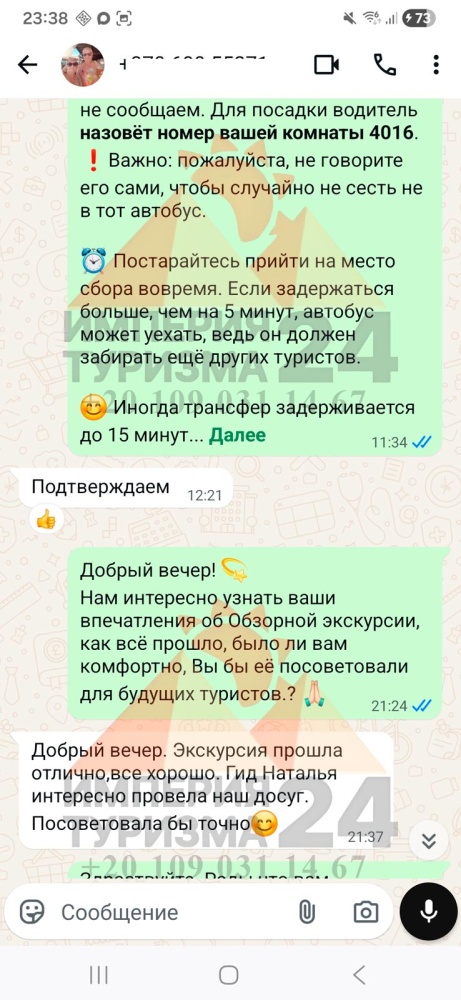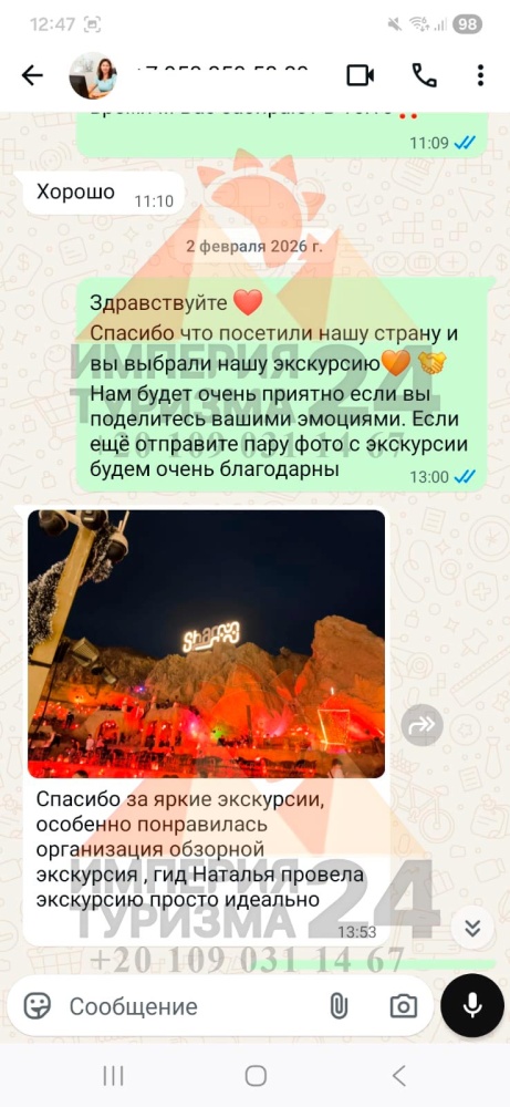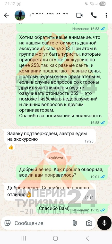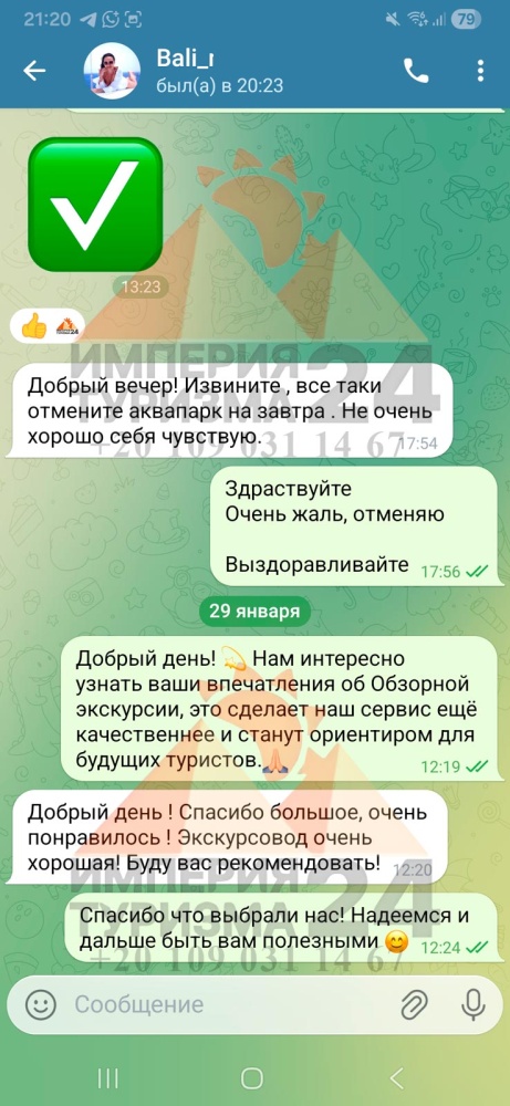 Просто напишите нам в WhatsApp или Telegram - и всё! Укажите название экскурсии, дату, отель, номер комнаты и свой контактный телефон. На сайте вы найдёте удобные иконки - кликаете, и уже на связи с нами.