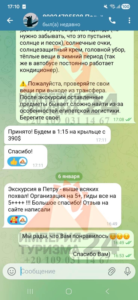 Просто напишите нам в WhatsApp или Telegram - и всё! Укажите название экскурсии, дату, отель, номер комнаты и свой контактный телефон. На сайте вы найдёте удобные иконки - кликаете, и уже на связи с нами.