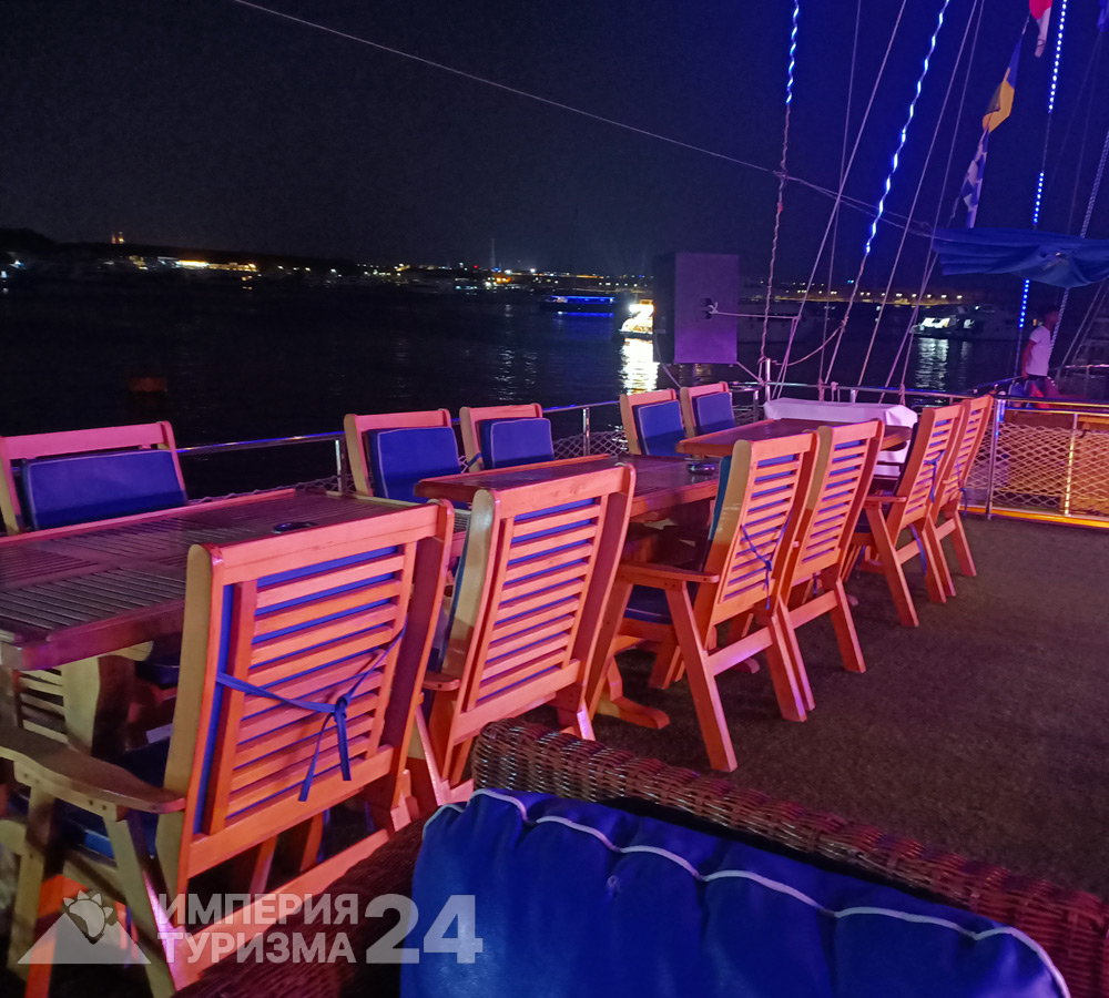 Название судна переводится как «Мечта Синая» и именно так вы себя почувствуете, стоя на палубе, усыпанной мягкими диванами и качелей над водой. На борту вас ждёт расслабляющий морской круиз, ужин из свежих морепродуктов и яркое восточное шоу: танец живота, танура, выступления фокусника.
