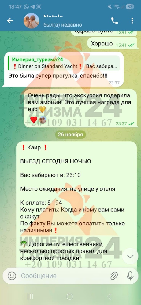 Просто напишите нам в WhatsApp или Telegram - и всё! Укажите название экскурсии, дату, отель, номер комнаты и свой контактный телефон. На сайте вы найдёте удобные иконки - кликаете, и уже на связи с нами.