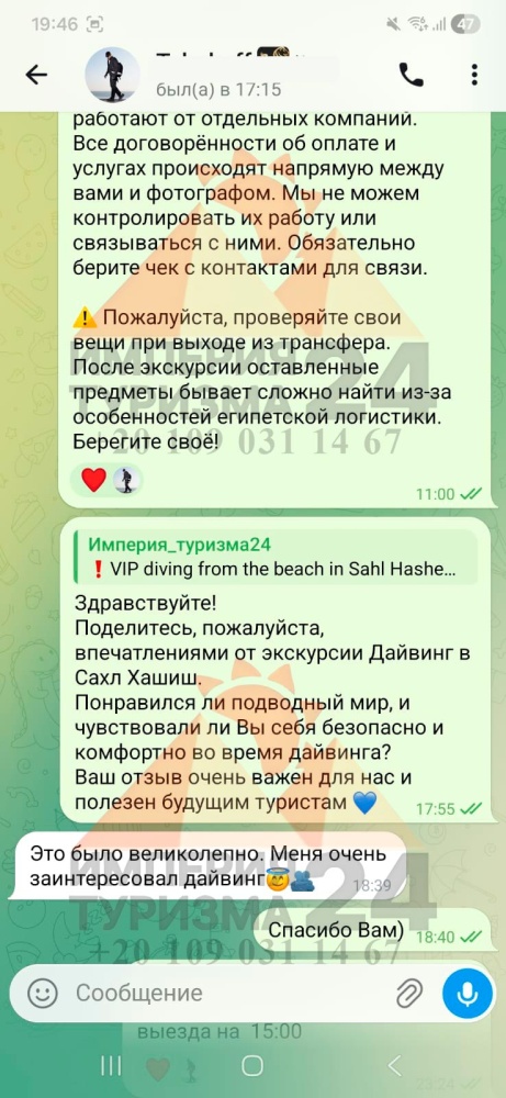 Просто напишите нам в WhatsApp или Telegram - и всё! Укажите название экскурсии, дату, отель, номер комнаты и свой контактный телефон. На сайте вы найдёте удобные иконки - кликаете, и уже на связи с нами.