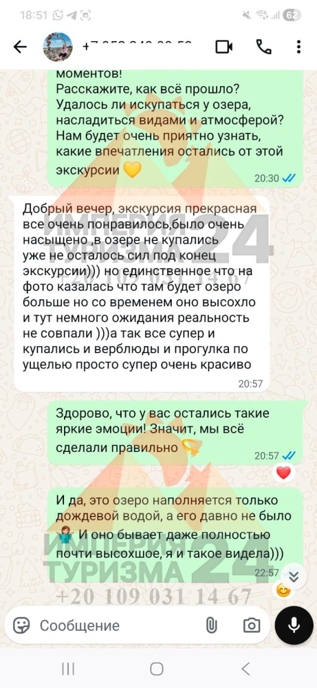 Время выезда и возвращения, указанное на сайте - ориентировочное. Не волнуйтесь! Накануне экскурсии мы отправим вам точное время сбора и что брать с собой в WhatsApp или Telegram. Так что просто оставайтесь на связи.